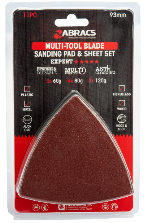De Abracs 11-delige schuurpad en schuurvellen set is geschikt voor de meeste schuurwerkzaamheden. De set bestaat uit 1 schuurpad en 10 schuurvellen, met 3 korrelgroottes (3 x 60G, 4 x 80G en 3 x 120G). De pad heeft een universele aansluiting die compatibel is met de meeste gangbare multitool-merken.