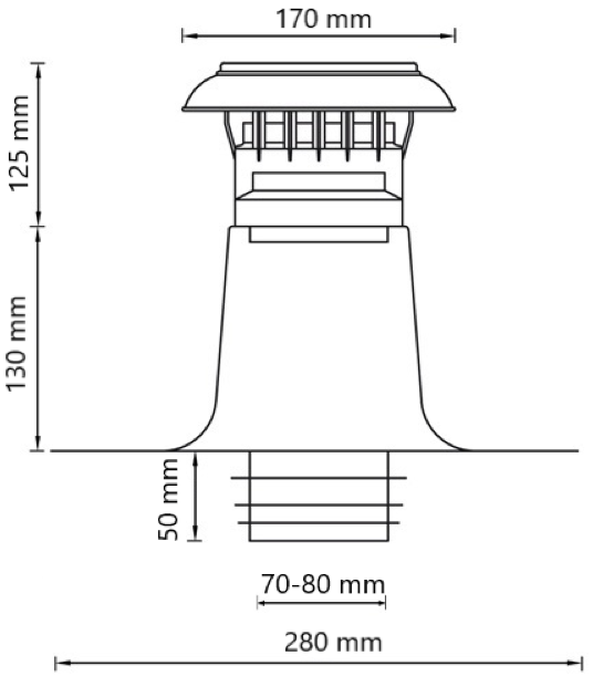 Dubbelwandige platdakontluchting met kunststof kap en aluminium plakplaat voor buisdiameters tussen 50-60mm, 70-80mm, 90-100mm, 110-125mm en 150-160mm.