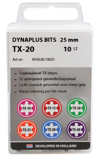 Iedere Dynaplus® TX-drive bit heeft een kleurbandje met een eigen kleur, deze kleur vind je ook terug op het etiket van het doosje. Als je verschillende afmetingen TX-schroeven gebruikt moet je soms van bitje wisselen. Verschillende afmetingen bitjes zijn lastig herkenbaar en dat maakt bitjes wisselen lastig. Dit handige kleursysteem lost dit probleem op.