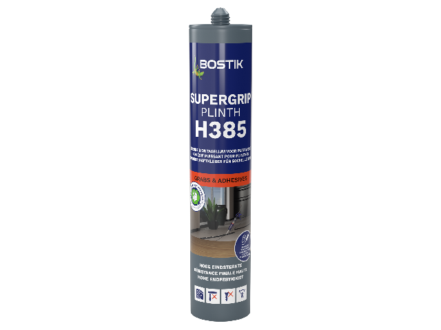 H385 SUPERGRIP PLINTH is specially developed as a universal adhesive for bonding various lightweight porous and non-porous building materials such as skirting boards, profiles, cover strips, and rosettes. Due to its high initial tack, temporary fixation (clamping or propping) is often not required. H385 SUPERGRIP PLINTH should not be used on PE, PP, PC, PMMA, PTFE, soft plastics, neoprene, and bituminous substrates. Discoloration may occur in dark areas and after contact with chemicals.