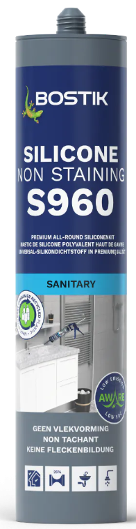 Bostik S960 Silicone Non Staining is a durable, all-purpose silicone sealant. This neutral-curing, plasticizer-free silicone is suitable for sealing all types of joints in sanitary areas, façades, glazing, and natural stone.