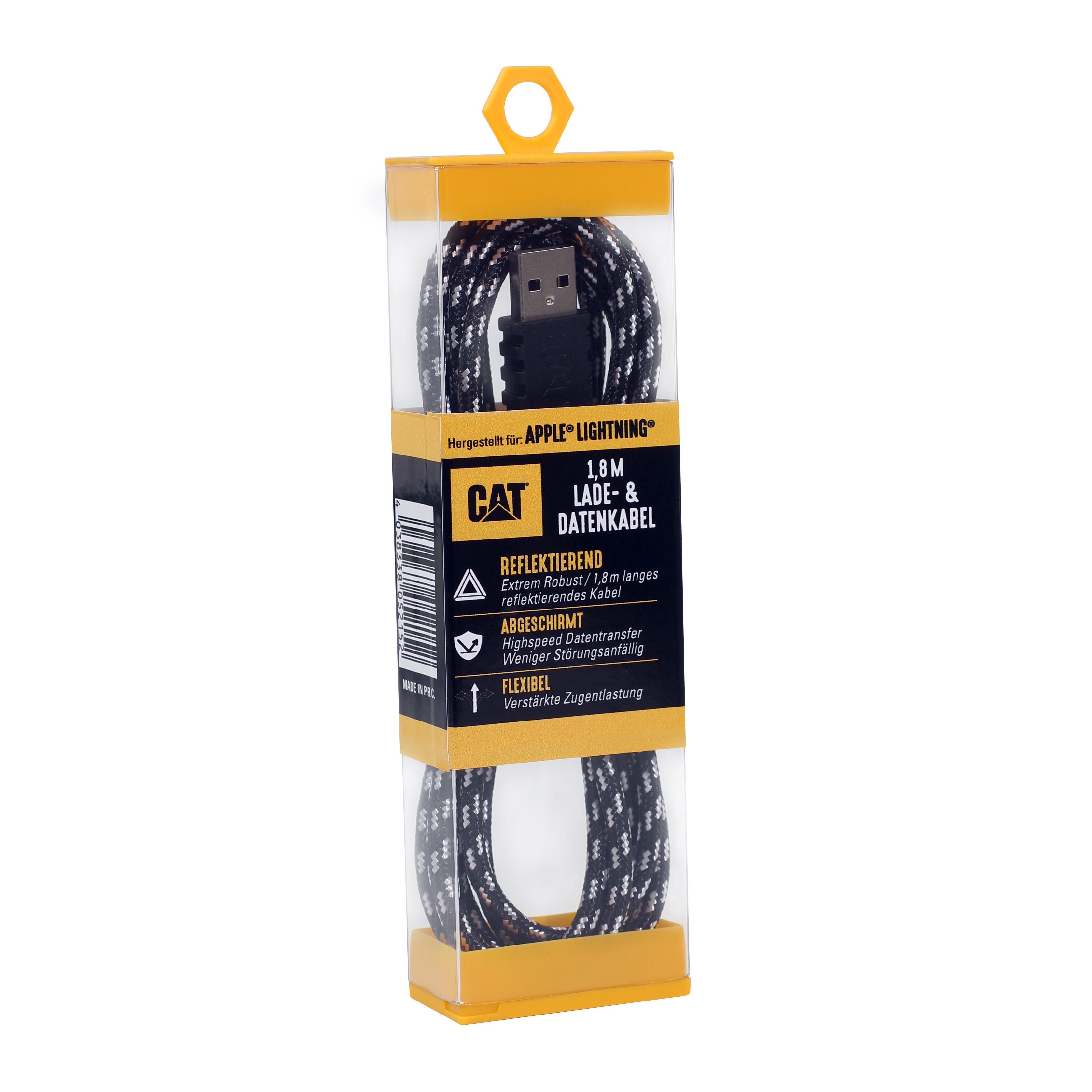 CAT USB-A data cable Apple lightning is made of double-woven reflective nylon and PVC sheathed. This cable has a length of 180 cm.