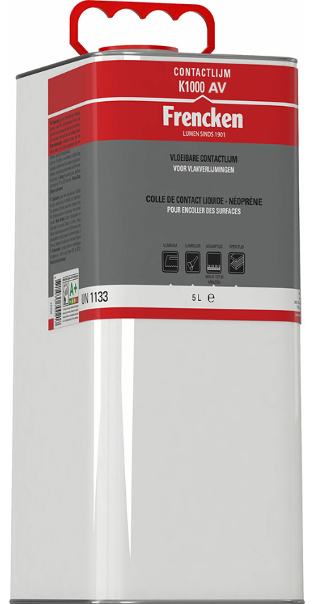 A ready-to-use, liquid, and easily spreadable contact adhesive, free of aromatic solvents, and therefore less harmful to humans and the environment. Contact Adhesive K1000 AV is specifically developed for bonding flat connections. The most common application is bonding HPL to various substrates. Due to its high initial adhesion, the Frencken contact adhesive is highly suitable for so-called 'curved work,' where the stress on the bond is particularly high.