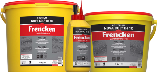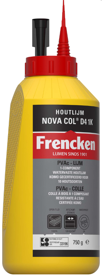 NOVA COL® D4 2K is suitable for construction and wood joints such as dowels, tongues, dovetails, mortise and tenon joints, assembly bonding, façade cladding, doors, and garden furniture. KOMO certified for façade cladding in almost all popular wood types.