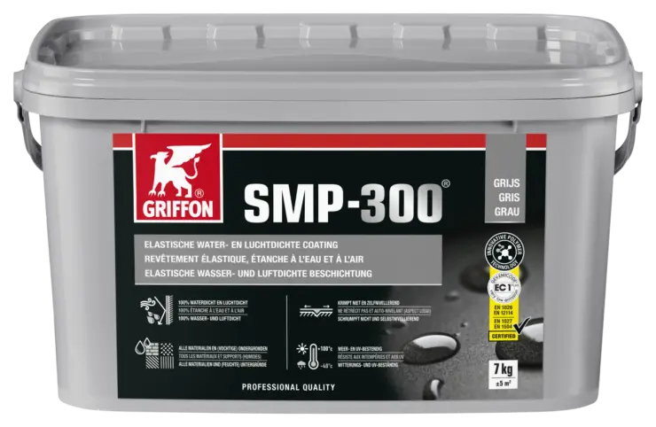 - Instructions: Open the can and apply the first layer with a brush. Apply in 1 (Airtight constructions) or 2 (Waterproofing) layers. Apply the first layer to the surface with a brush or roller. Use GeoTextile from Griffon for joint, crack, and crack-bridging applications. Press the GeoTextile into the wet layer until fully saturated with the coating. Apply a second layer of SMP-300® within 1 hour (or at least before skinning occurs) on the GeoTextile, or after the first layer has fully cured (approximately 6 - 8 hours*). Optionally, sprinkle slate chips into the still wet layer to create a cohesive appearance for the entire roof. *Coating cures through moisture and moisture in the substrate.