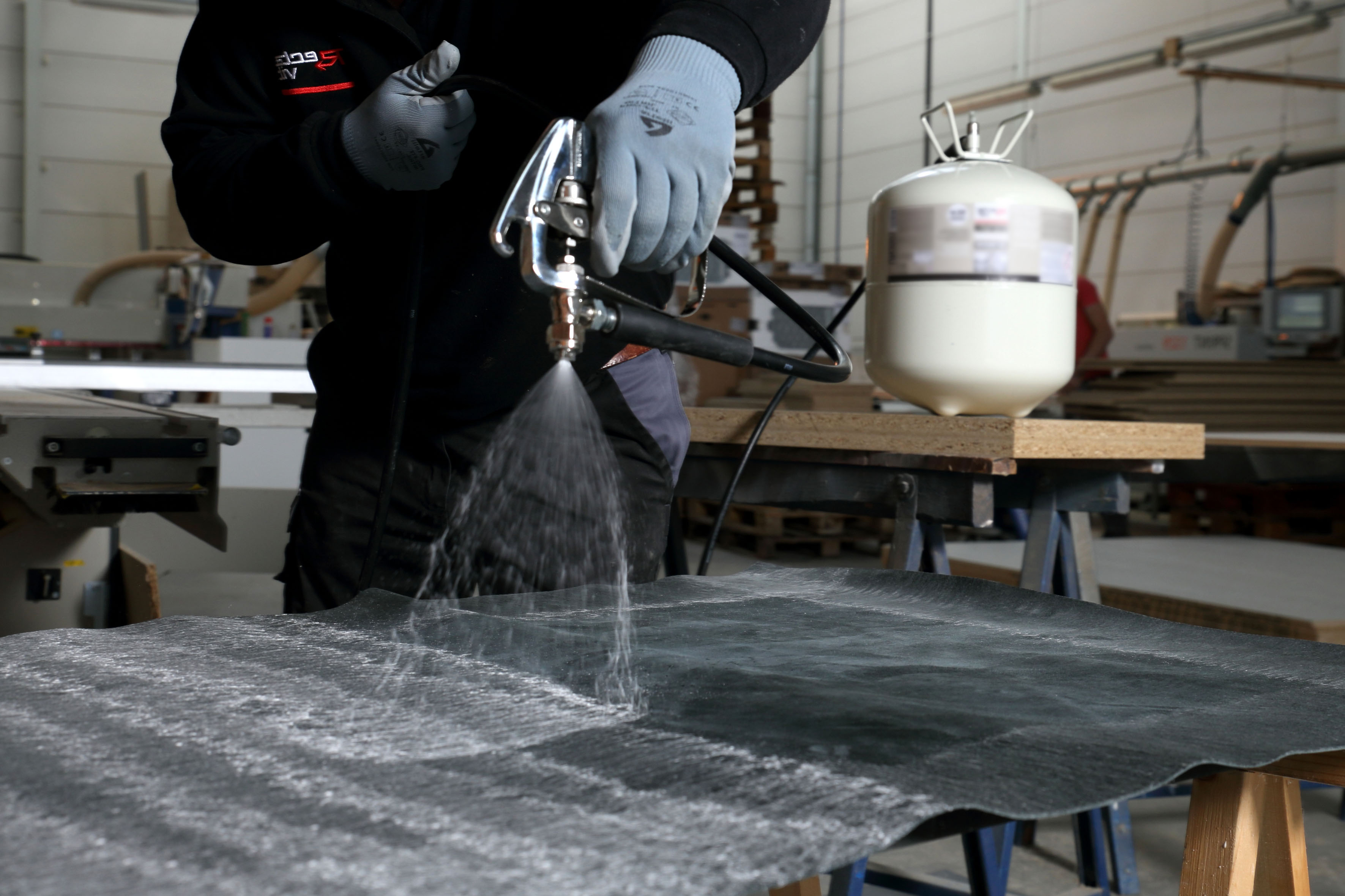 Sprayable contact adhesive with an extremely short evaporation time for ultra-fast bonding of laminate (HPL) and veneer on more porous substrates, including edge banding. Ideal for flexible materials such as linoleum, leather, cork, and rubber.