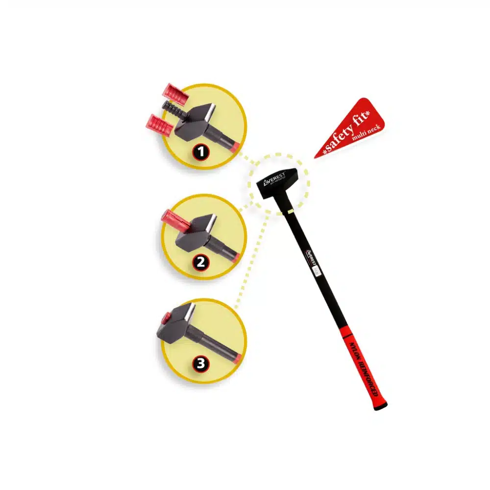 Het unieke en gepatenteerde Everest Safety Fit Multi Neck systeem is een innovatieve en veilige bevestiging van de hamerkop aan de fiberglassteel. Deze bevestigingsmethode voorkomt het losschieten van de hamerkop en daarmee gevaarlijke situaties.