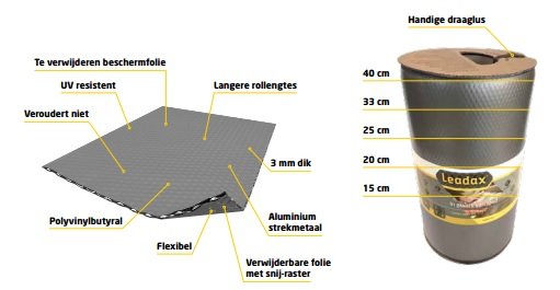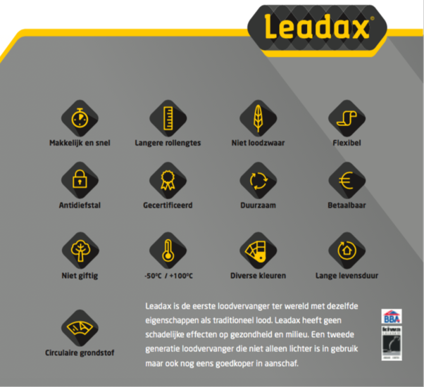 Leadax loodvervanger is een loodvervanger met bijna dezelfde eigenschappen als traditioneel lood. Een tweede generatie loodvervanger die niet alleen lichter is in gebruik, maar ook nog eens goedkoper in aanschaf. Van spouwmuur tot aan schoorsteen, de toepassing en verwerking van Leadax is identiek aan die van Lood. Zonder compromis!