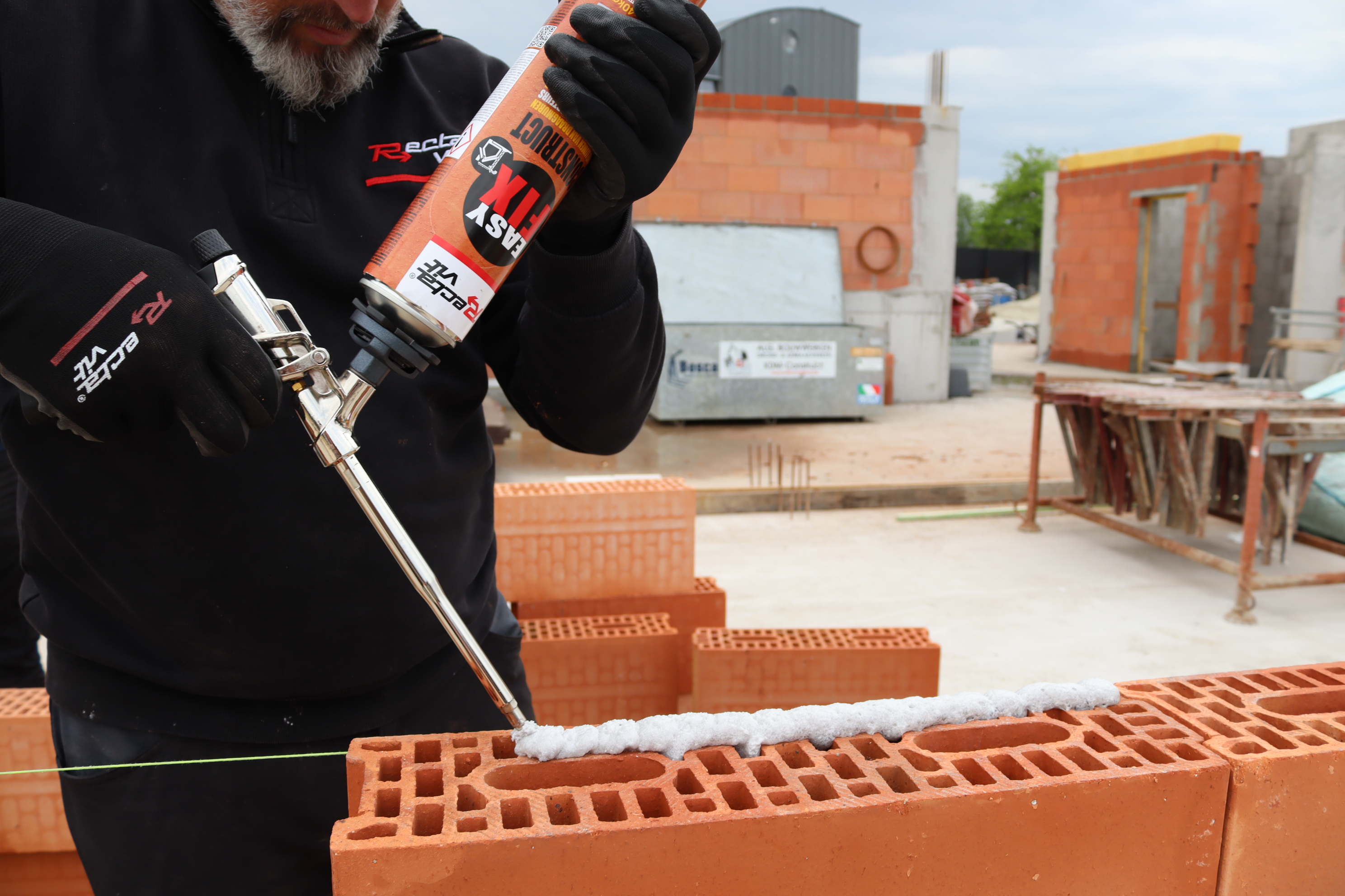 Gecertificeerd polyurethaan lijmschuim voor dragende muren met vlakgeslepen keramische snelbouw- (holle bouwsteen), silicaat-, cellenbeton- en betonlijmsteen van hoge maatnauwkeurigheid.