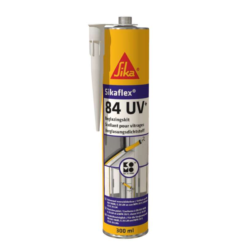 Het afdichten van alle soorten beglazingen, met name isolerend glas. Sikaflex-84 UV+ is zeer goed bestand tegen alle weersinvloeden en hecht zonder primer uitstekend op bijvoorbeeld glas, hout en vele lakafwerkingen. Op andere materialen, zoals PVC, is het gebruik van een primer noodzakelijk.
