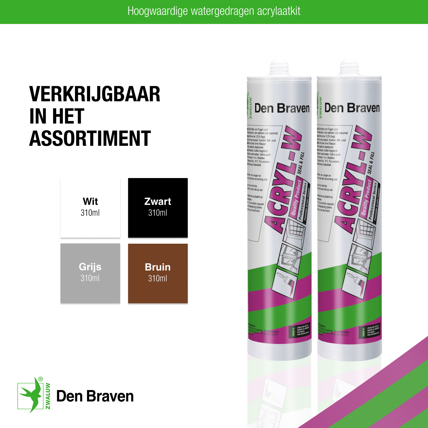 Zwaluw Acryl-W is een acrylaatkit, hoogwaardig en watergedragen. Deze acrylaatkit is op basis van acrylaatdispersie. Prima overschilderbaar met watergedragen en synthetische verven en tevens gemakkelijk aan te brengen.